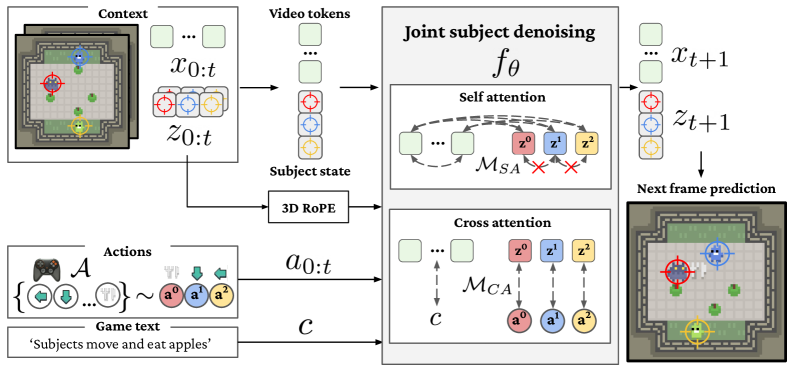 Second, a cross-attention block (Figure 4) with an explicit subject-action binding mechanism is used to update the subject states themselves based on the new action inputs. Crucially, the model specifically links each agent's action to its respective subject state token, preventing the actions from getting confused or misapplied. This disentanglement of global video rendering from individual action-controlled subject updates is what allows ActionParty to maintain identity consistency and accurate action following for multiple agents simultaneously.