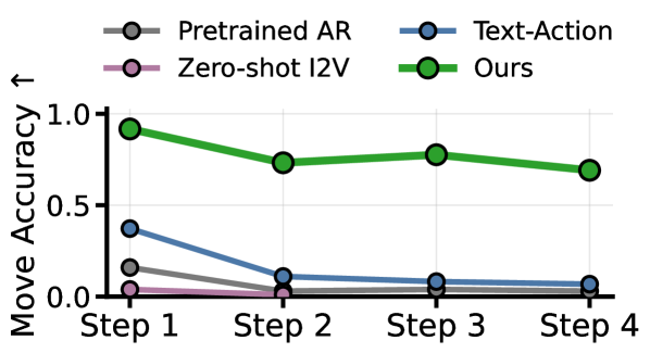 - Action-Following Accuracy: The model shows significant improvements in action-following accuracy compared to baselines. While other models quickly degrade, ActionParty maintains stable action binding across multiple autoregressive rollout steps (Figure 6).
