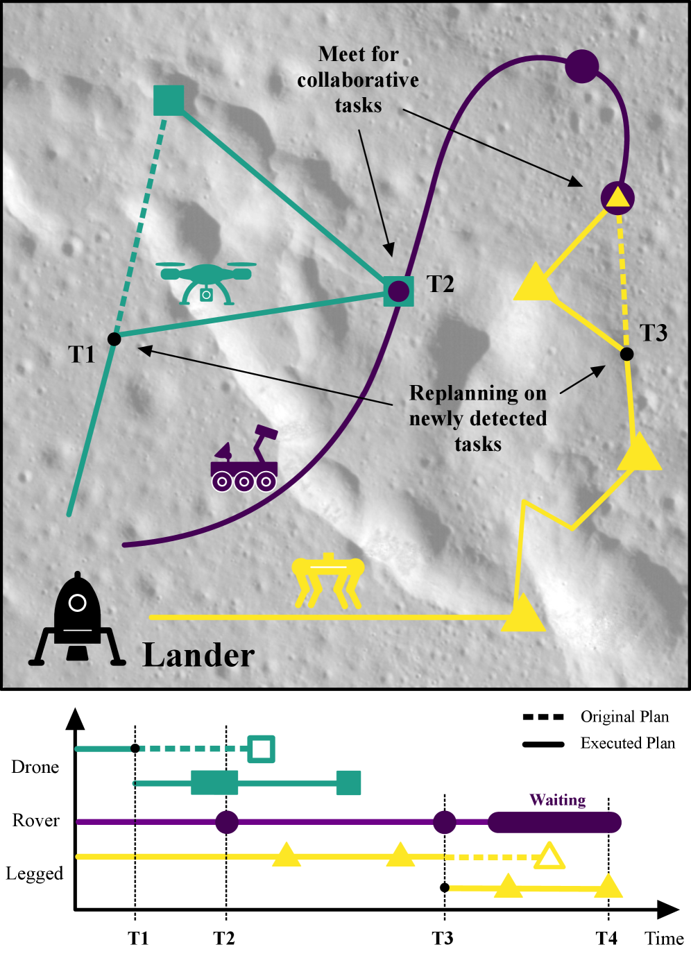 Figure 1: An illustrative plan for a collaborative robot fleet with different specializations, such as flying, walking, or driving. During the mission the drone and the legged robot find new tasks and replan to minimize mission time.