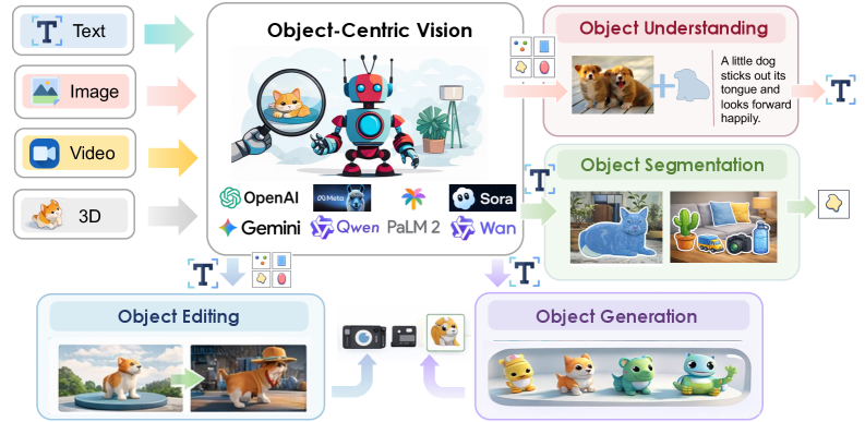Figure 1: Overview of object-centric vision in the era of large multimodal models. The modalities considered in this paper include images, videos, and 3D data. Object-centric representations enable four fundamental capabilities: object understanding, object segmentation, object editing, and object generation.