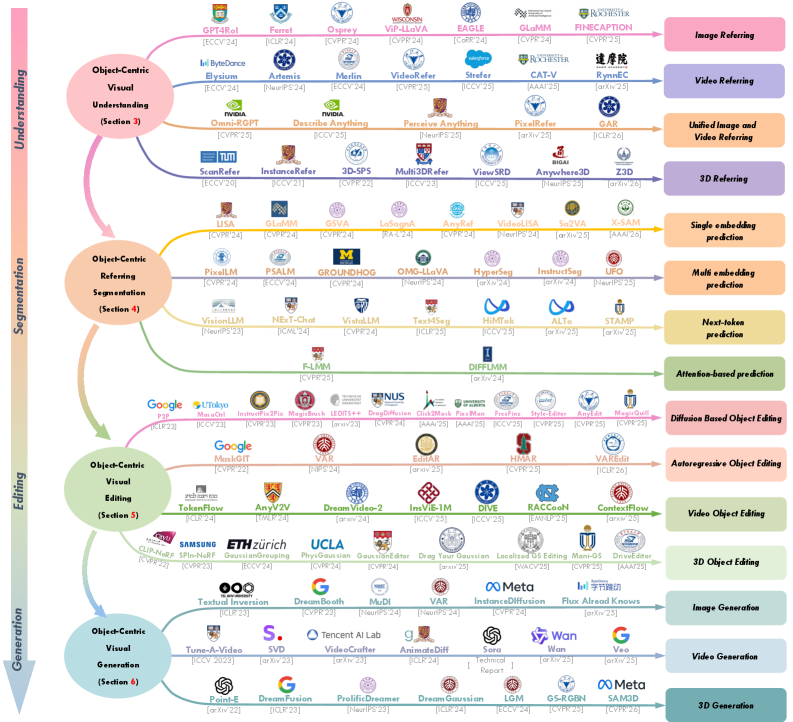 Figure 2: Summary of representative models spanning object-centric visual understanding, segmentation, editing, and generation. For a comprehensive list of related approaches, along with detailed discussions of their specifications, configurations, and technical aspects, please refer to Section 3, Section 4, Section 5, and Section 6, respectively.