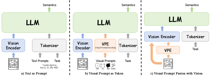 Figure 3: Illustration of three representative paradigms for incorporating visual prompts into multimodal large language models: Text as Prompt, Visual Prompt as Token, and Visual Prompt Fusion with Vision. These paradigms differ in whether visual prompts are expressed as language, injected as prompt tokens, or fused directly with visual representations before language modeling.