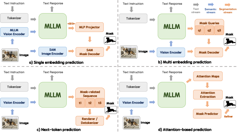 Figure 4: Four representative language–pixel interfaces for LMM-based object-centric referring segmentation: (a) single embedding prediction, (b) multi embedding prediction, (c) next-token prediction, and (d) attention-based prediction. They differ in whether the segmentation signal is expressed as one prompt embedding, multiple mask-aware queries, a generated mask-related sequence, or an attention-derived spatial field.