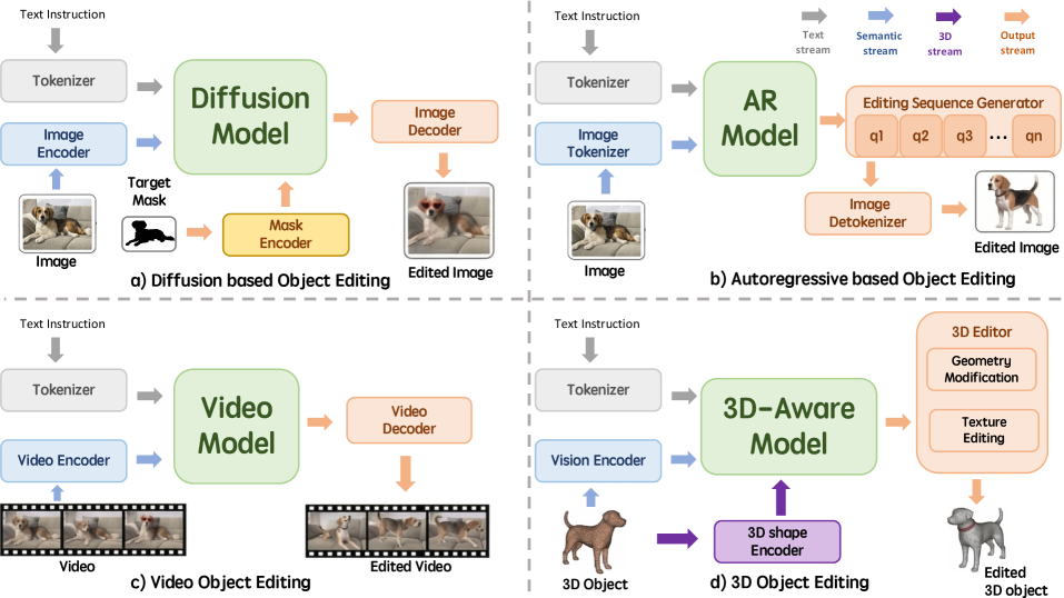 Figure 5: Four representative paradigms for generative model-based object editing: (a) Diffusion-based Object Editing, (b) Autoregressive-based Object Editing, (c) Video Object Editing, and (d) 3D Object Editing. They differ in their core generative mechanisms and target modalities, specifically utilizing diffusion processes for standard 2D images, autoregressive models to generate tokenized editing sequences, video models for temporal frame sequences, and 3D-aware models for geometry and texture modifications.