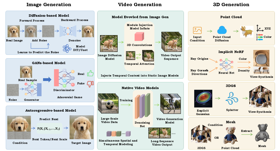 Figure 6: Overview of generative methodologies for multimodal content creation. The figure categorizes mainstream approaches for image, video, and 3D generation, highlighting the evolution from static 2D synthesis to complex spatial and temporal modeling.