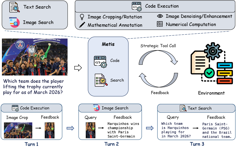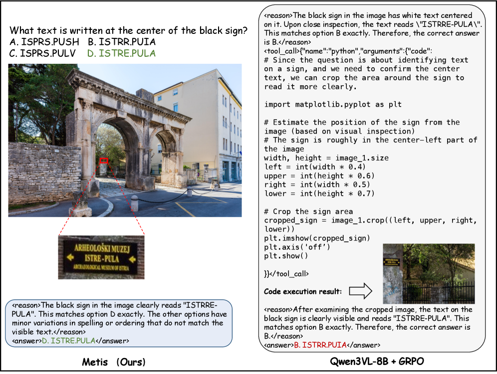 The resulting model, Metis, is designed as a strategic multimodal reasoning agent. As shown in Figure 3, Metis selectively invokes tools like code execution, text search, and image search during multi-turn reasoning. It doesn't just call tools by default; it adaptively determines when a tool will genuinely provide useful evidence and when it can reason directly from the available context.