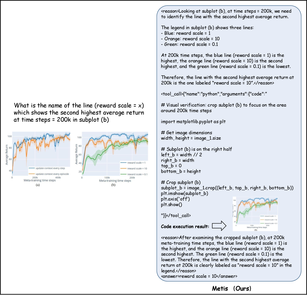Figure 5: Targeted code execution for fine-grained visual analysis. The question requires comparing curves in a specific subplot region that is difficult to resolve at the original image scale. Metis invokes code to crop and enlarge the relevant area, enabling precise identification of the curve behavior near the queried time step.