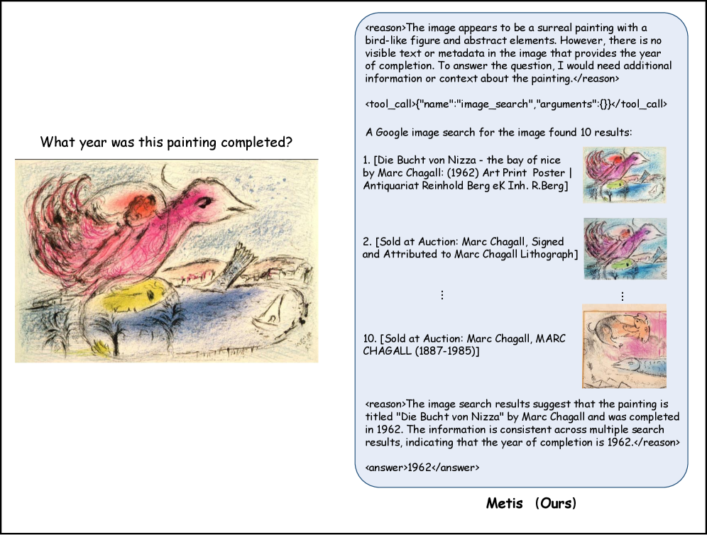 Similarly, when visual identification alone is insufficient, Metis intelligently resorts to external search. Figure 7 demonstrates Metis initiating an image search to identify an artwork that cannot be reliably recognized from its visual features alone, then extracting the required information from the search results.