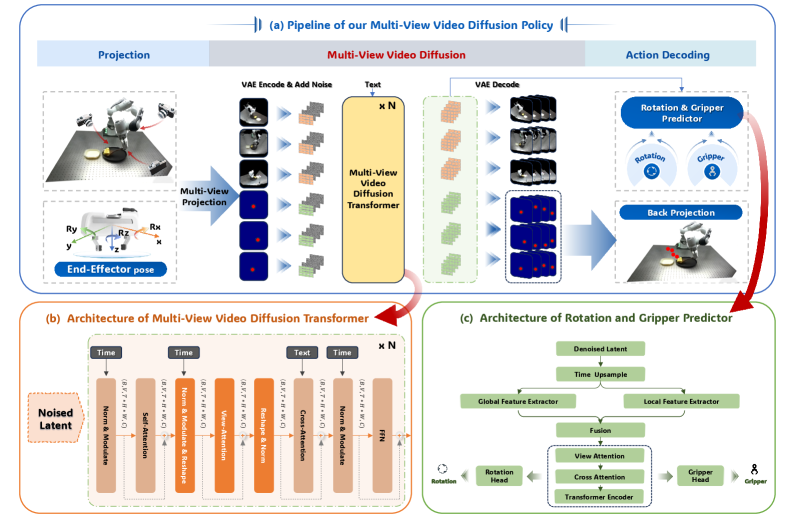 MV-VDP tackles these issues head-on by building a policy that inherently understands the 3D spatio-temporal state of the environment. Instead of piecing together 3D from single 2D views, it processes multi-view images simultaneously. Here's the breakdown: