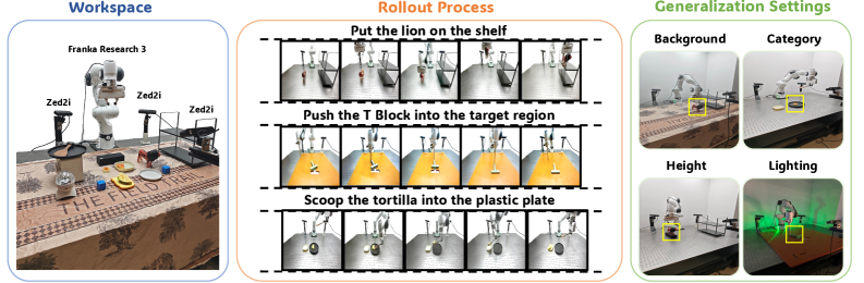 Figure 3: Real-world experimental setup and tasks. MV-VDP was evaluated on three manipulation tasks using a Franka Research 3 robot with three ZED2i cameras, including generalization assessments under various environmental conditions.