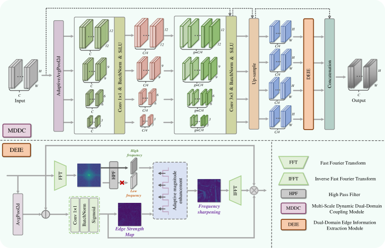 Figure 3: The detailed structure of the MDDC module. The MDDC module initially performs multi-scale decomposition on the input feature map to construct the base representation. Subsequently, through DEIE, it achieves complementary feature fusion in both the spatial and frequency domains. In the frequency domain branch of DEIE, features undergo spectral decomposition, removing low-frequency noise disturbances while enhancing high-frequency feature representations.