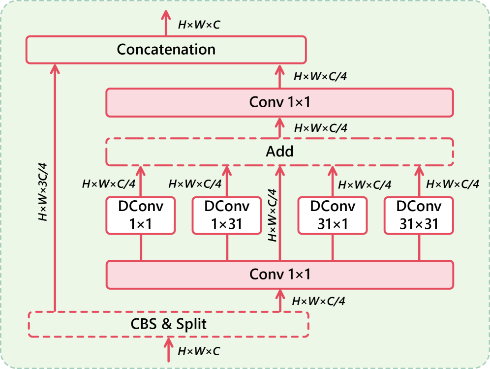 Figure 4: The detailed structure of the WPM. WPM employs a parallel structure consisting of a large kernel convolution, a small kernel convolution, and two strip convolutions.