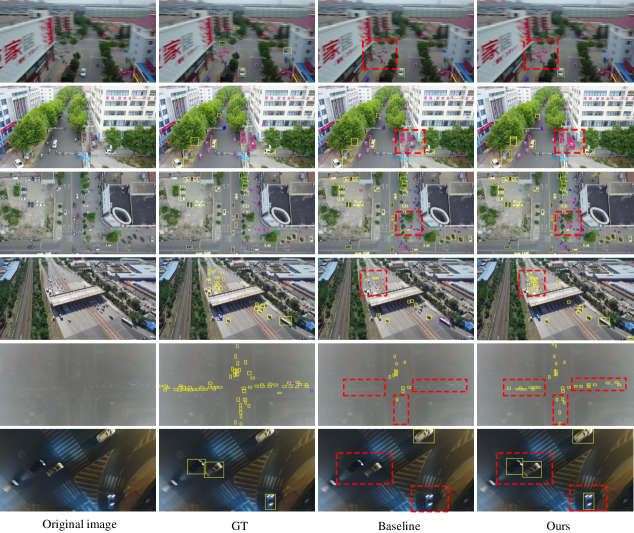Figure 6: The comparison of detection visualization results between the baseline model and SFFNet. The first three rows are from the VisDrone dataset, and the last three are from the UAVDT dataset. Our model performs better in handling dense areas from various perspectives (rows 2–4), noise occlusion resulting from specific weather conditions (row 5), and blur caused by camera rotation (rows 1 and 6).