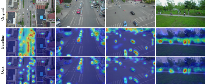Figure 7: The comparison of heatmap visualization results between the baseline model and SFFNet on the VisDrone dataset. Our model not only suppresses irrelevant background noise but also focuses more on detecting the target objects.
