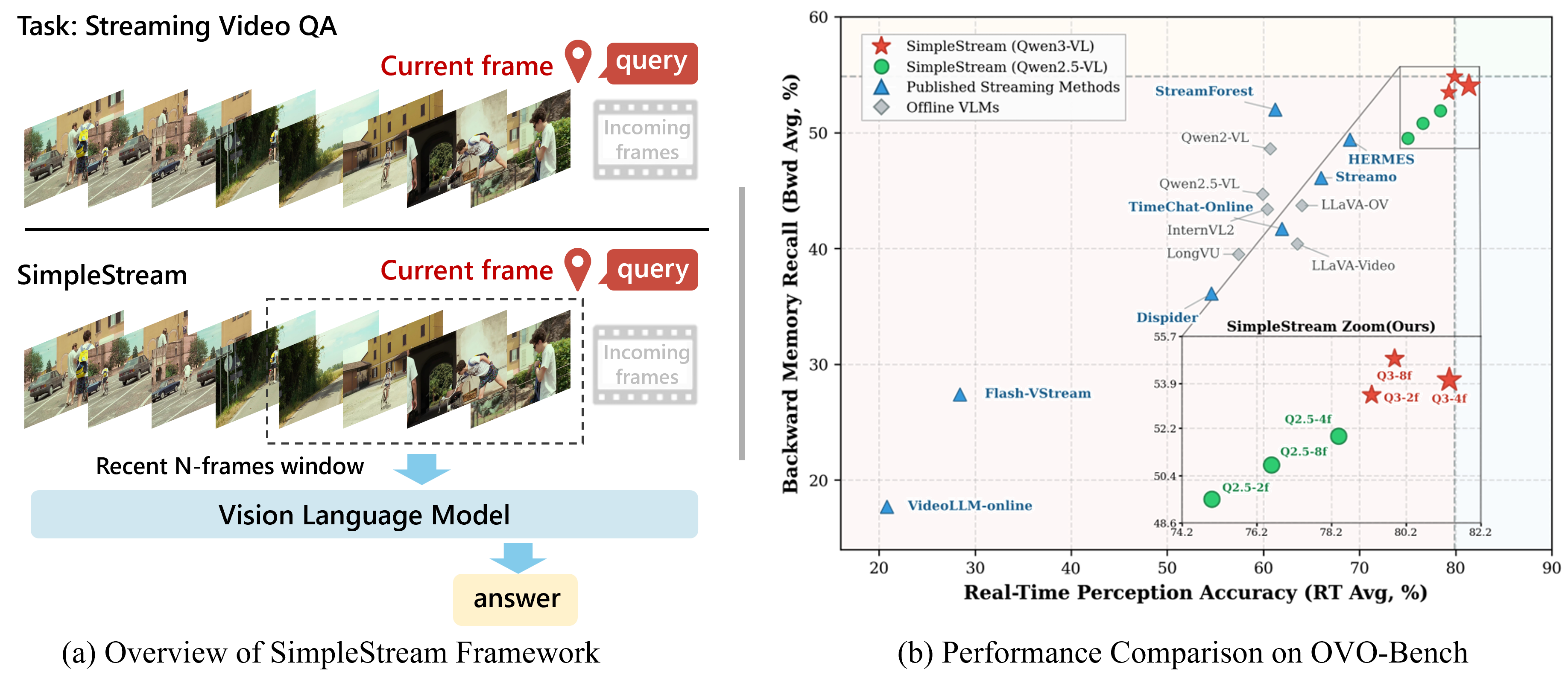 Figure 1: SimpleStream's elegant approach (a) feeds only the most recent N frames to a VLM, consistently achieving top-right performance on perception-memory metrics (b).