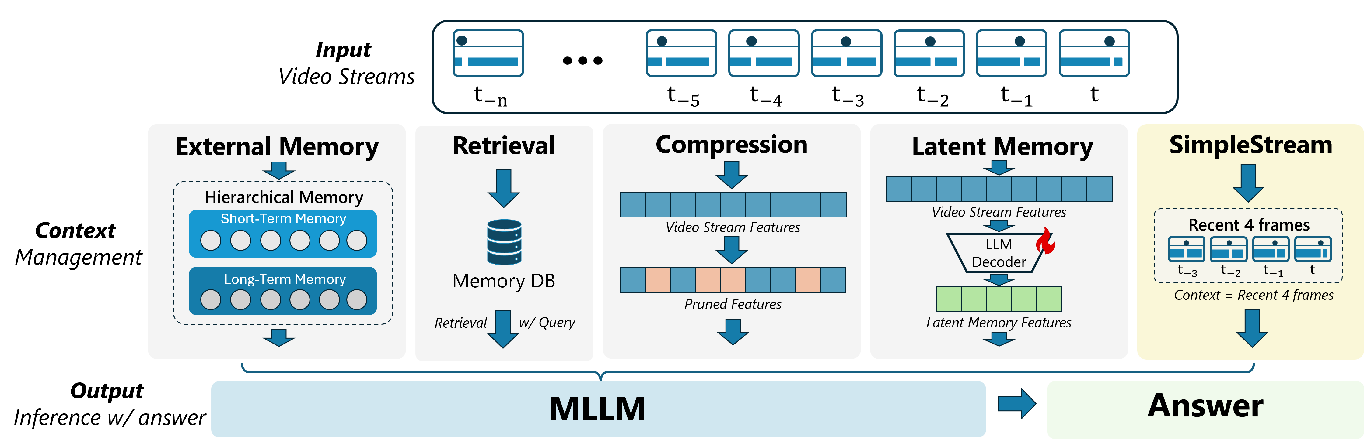 Figure 2: While most methods focus on complex historical information management, SimpleStream keeps it simple with a recent frame window.