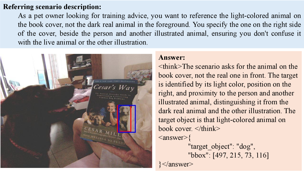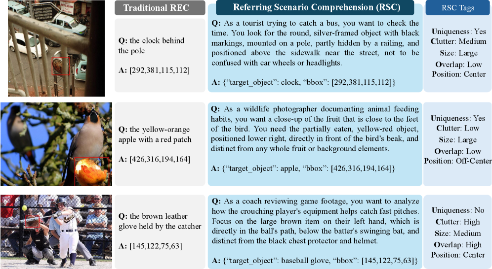 The RSC benchmark fundamentally changes how we train visual AI. Instead of short, explicit object names, it uses paragraph-length text queries that describe user roles, goals, and contextual cues. These queries are designed to be challenging, often including deliberate references to distractor objects that require deep understanding to resolve.
