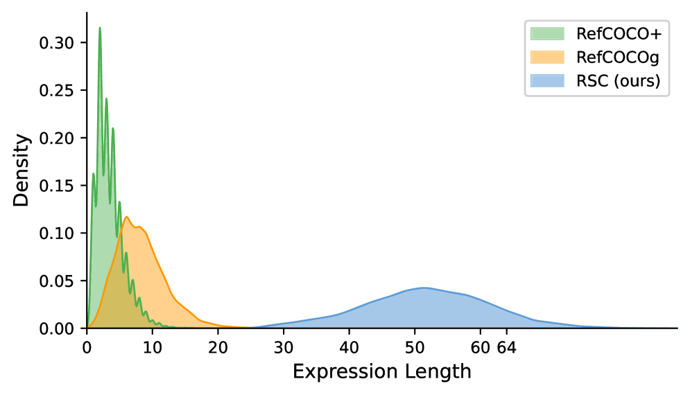 RefCOCO+andRefCOCOg. This requires models to process and understand significantly more information (Figure 5). - The dataset covers a broader range of instance sizes, with a higher density of smaller objects, which are notoriously difficult for vision systems (Figure 6).