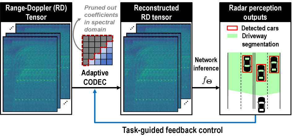 Figure 1: Adaptive codec with task-guided feedback control. We propose an adaptive codec that compresses high-dimensional range-Doppler data by pruning spectral domain coefficients. A feedback loop adaptively regulates the compression ratio, guided by the performance of downstream perception tasks.