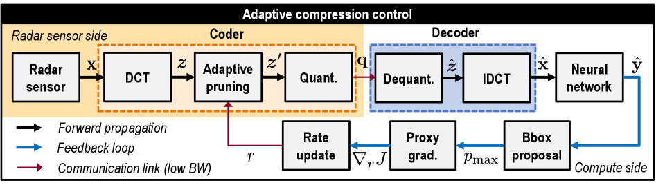 Figure 2: AdaRadar: Online rate-adaptive radar compression framework. Our proposed method introduces a feedback loop in which the proxy gradient is computed from the detection outputs to update the compression ratio adaptively. This avoids the need for backpropagation through the communication channel. The radar tensor is compressed using DCT, adaptive spectral pruning, and scaled quantization, then transmitted to the compute side. In an object-detection setting, the neural network produces detection results from decompressed radar data cubes. The loop uses proposed bounding boxes to estimate the proxy gradient, thereby updating the pruning rate.