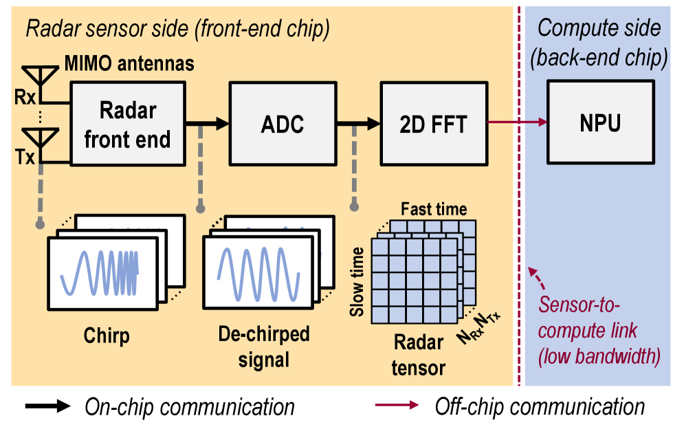Figure 3: Radar-based perception system overview. An FMCW radar transmits linearly swept‑frequency chirps. The incoming echo is mixed with a copy of the transmitted chirp at the receiver, yielding a de‑chirped intermediate‑frequency signal that the ADC digitizes to form a raw radar tensor. Successive FFTs along the fast‑time and slow‑time axes convert this tensor into a range–Doppler cube. The large, raw radar tensor is transferred to the NPU over the power-hungry sensor-to-compute link for network inference.