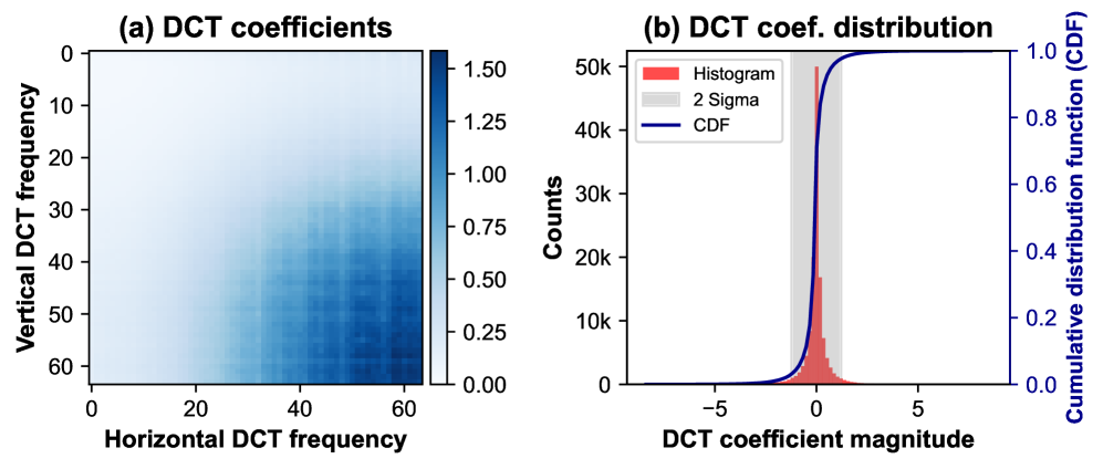 Figure 4: Motivation for spectral pruning and quantization. (a) The DCT coefficient magnitudes are clustered in the high-frequency bins. (b) Their histogram is sharply peaked, highlighting strong sparsity and clear opportunities for compression.