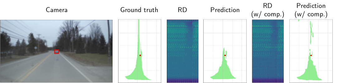 Figure 9: Qualitative comparisons. Networks are trained on raw radar tensors, visualized as range-Doppler (RD) images, along with ground-truth labels for freeway segmentation and vehicle detection. Camera images only provide contextual reference for the scene. RD images map Range to the yy-axis and Doppler to the xx-axis. We highlight the detected car in red and the segmented map in green in the bird’s-eye-view visualization. Notably, the compressed RD outperforms the uncompressed baseline.