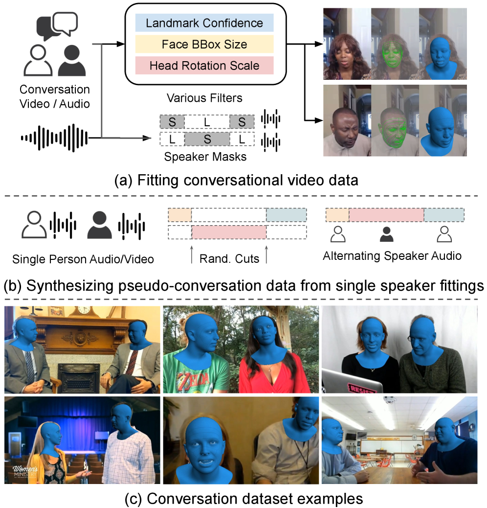 The dataset combines real dyadic videos with synthetic “pseudo-conversations” to create a robust training set.