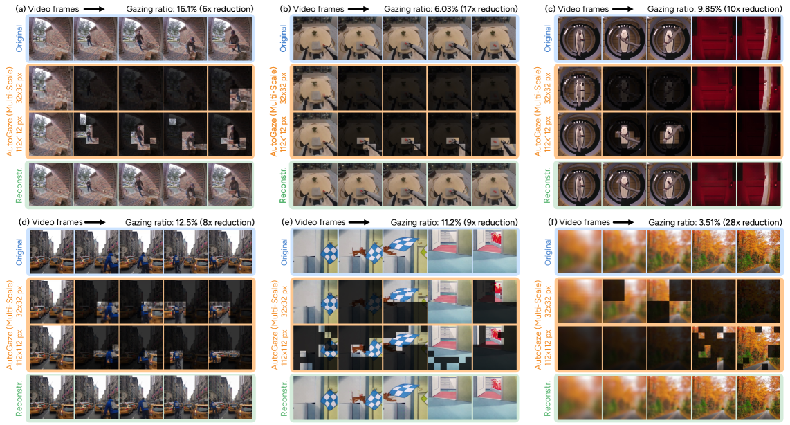 Figure 1: AutoGaze selectively focuses on moving objects and adapts attention granularity based on scene detail, significantly reducing visual data while preserving key information.