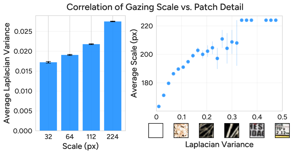 Figure 4: AutoGaze adjusts its gazing scale based on patch detail, selecting finer scales for more intricate regions and coarser scales for less detailed areas.