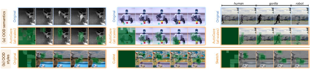 Figure 5: AutoGaze robustly tracks changing parts in videos with out-of-distribution semantics or style transfer, demonstrating strong generalization capabilities.