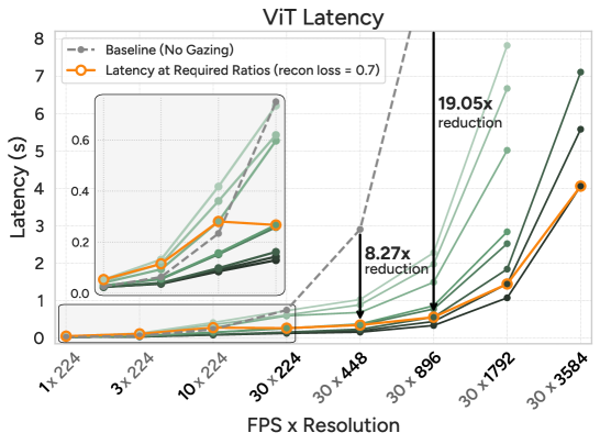 - Gazing Ratio: For 30-FPS, 4K-resolution videos, it needs only around ~1% of patches to achieve a reconstruction loss of 0.7. This is a staggering efficiency.