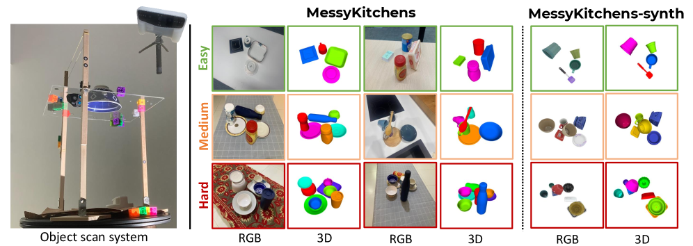 Figure 2: On the left, we show our object scanning system. The transparent surface allows us to take multiple scans without moving the object. On the right, we show samples of MessyKitchens, for three difficulty levels. Scenes get more cluttered and with more sophisticated object interactions with the increase of the difficulty. We also provide a synthetic set (MessyKitchens-synthetic) usable for training, with constructed scenes similar to the real dataset.