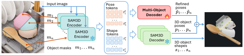 Figure 3: Multi-Object Decoder for 3D reconstruction. SAM3D outputs 3D shapes from input images and masks. To impose scene-level constraints, we use a Multi-Object Decoder refining SAM3D prediction on the pose of the objects. The residual refined term is summed to the original prediction to obtain a scene-aware pose estimation.