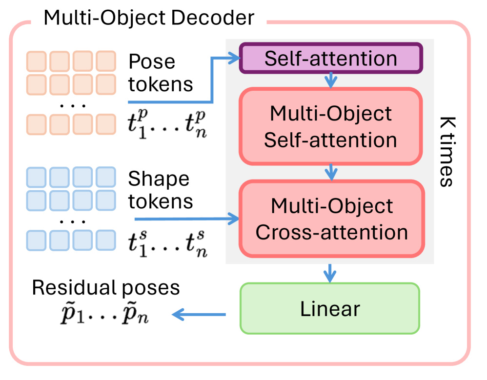 Figure 4: Multi-Object Decoder. We inform pose tokens on scene-level context by using KK blocks including multi-object self-attentions and cross-attention. We use pose and shape information from all objects to obtain residual pose correcting factors.