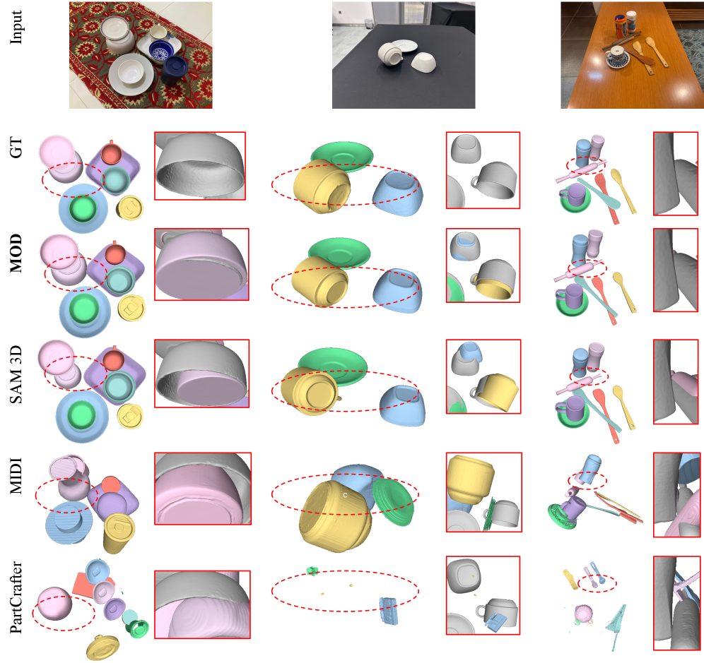 Figure 6: Qualitative comparison. We show examples of 3D reconstructions for MOD and alternative methods, on MessyKitchens. In the insets, we show significant scene-level improvements over SAM 3D, demonstrating the effectiveness of MOD.