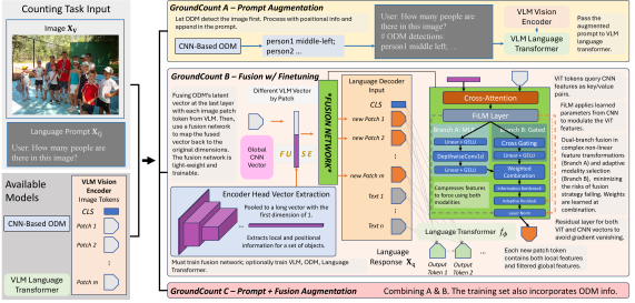 The paper also explored feature-level fusion (GroundCount B and C), where ODM and VLM features are merged before the VLM's final output. However, the explicit symbolic grounding via structured prompts (GroundCount A) generally outperformed these more complex architectural integrations.