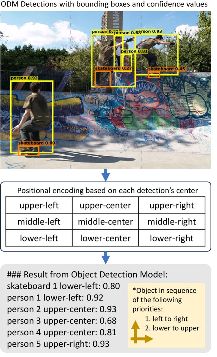 Figure 2: Our pipeline of converting ODM outputs to descriptive text. The image is #000000000077.jpg from COCO-train2017, showing 5 young people skateboarding. The bounding boxes (bbox) come from YOLOv13x’s detection: yellow ones are person objects; orange ones are skateboard objects. The location of each object is determined by the center of their corresponding bbox. Two skateboard objects were not included due to low confidence.