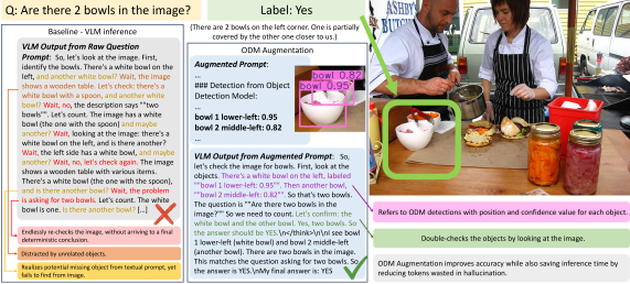 Figure 3: Illustration with real evaluation example for ODM prompt augmentation in GroundCount A. The image is #000000189241.jpg from COCO-val2014, which is used for a counting question in our selected benchmark, PhD. The tested VLM is Qwen3-VL-2B-Thinking. The question asks for a correctness judgment on the number of bowls in the image. There are indeed 2 bowls in the image, with one bowl partially covered by another. The baseline VLM, whose output is showcased in the left frame, fails to find the second bowl and re-thinks iteratively, exhibiting behaviors of hallucination. On the other hand, with information from the object detection model (ODM) appended in the prompt, the VLM successfully finds the second bowl with a double-check.