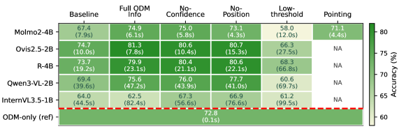 GroundCount Aactually reduced inference time by 22%. This is counter-intuitive, but the authors explain it: by providing accurate information upfront, the VLM avoids "hallucination-driven reasoning loops" where it wastes time trying to figure out a count it's bad at. - Ablation Insights: Positional encoding (telling the VLM where objects are) was critical for stronger models but surprisingly detrimental for weaker ones. Confidence scores from the ODM, often seen as important, introduced noise for most architectures, with performance improving when they were removed in four of five models. This suggests simpler, clearer input is often better.