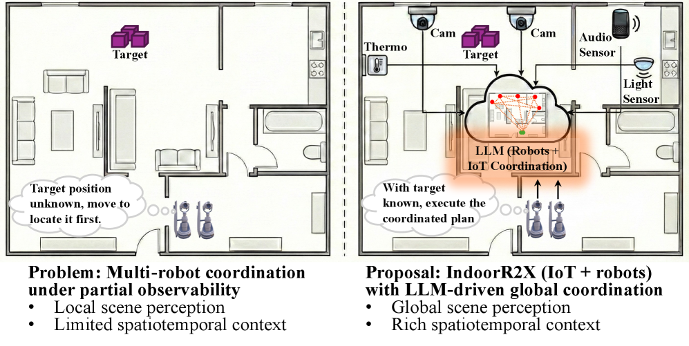 Figure 1: Motivation for IndoorR2X. Augmenting robot perception with global IoT context via LLMs for efficient coordination.