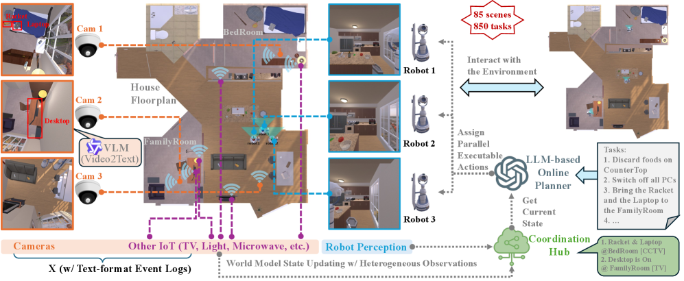 Figure 2: Our IndoorR2X framework. CCTV observations and other IoT device signals are collected to augment the world model beyond the perception range of the robots’ ego cameras. These heterogeneous observations are synchronized through a coordination hub, where an LLM-based online planner generates parallel actions for each robot and executes them to perform their respective tasks. As an example scenario, robots are assigned to perform household tasks in the morning. After potential overnight changes to object locations or device statuses (e.g., TVs), robots first update their indoor world model by leveraging the “X” observations.