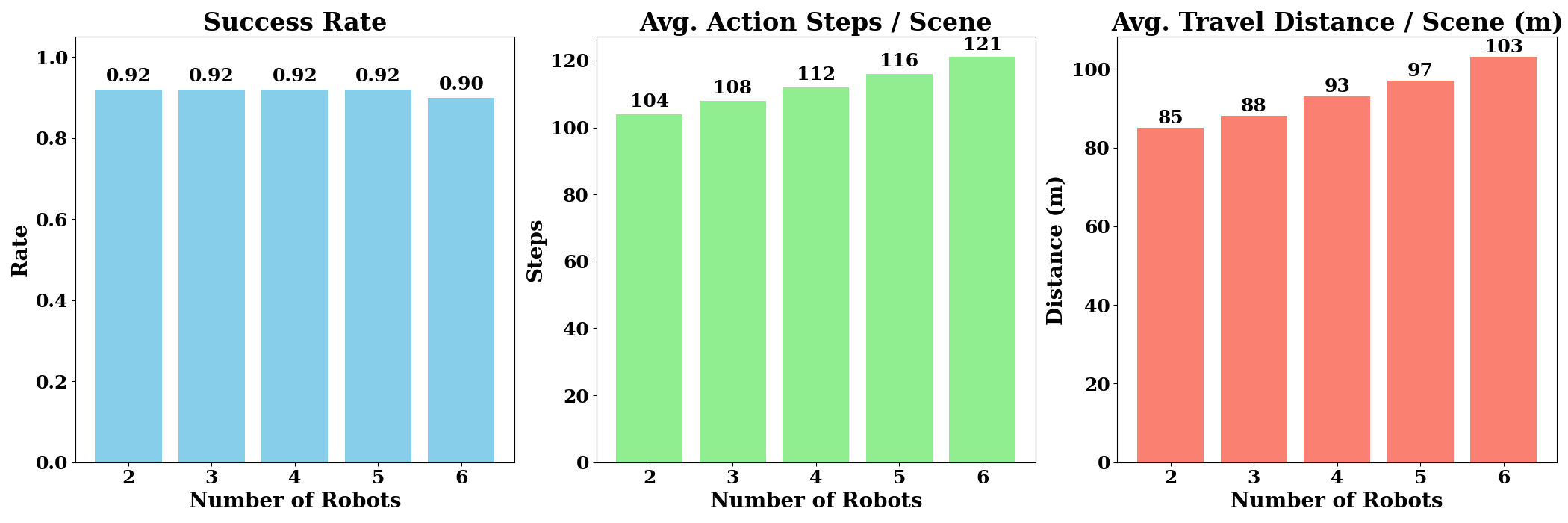 Figure 3: Scalability analysis. Success rate (left) and efficiency metrics (center/right) as a function of team size (N=2 to 6). While success remains stable up to N=5, the coordination overhead (total distance traveled) increases with fleet size.