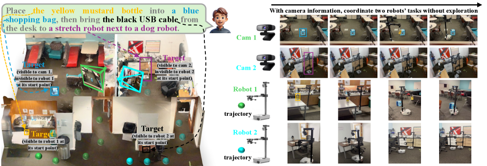 Figure 6: Illustration of our real-world experiment. Two mobile Stretch robots jointly perform tasks in a three-room environment, utilizing two web cameras for out-of-sight visibility. A third Stretch robot stands stationary by a robot dog as a target.