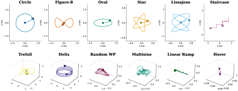 - 170+ Flight Trajectories: These include a variety of scenarios such as hovering, multi-frequency excitation, geometric tracking, and aggressive maneuvers.