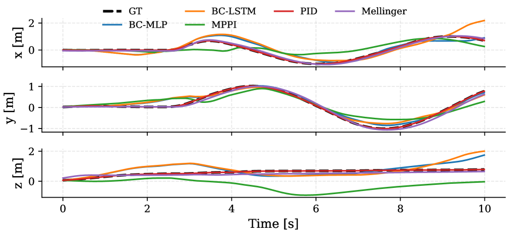 Offline machine learning-based controllers, such as MLP and LSTM, produced smoother trajectories compared to traditional PID and Mellinger controllers used in real flight.