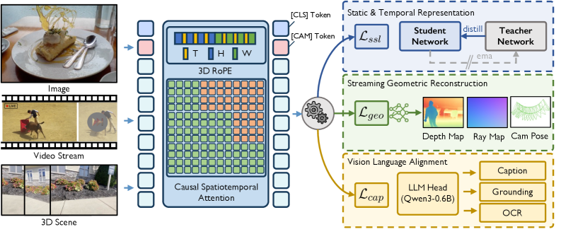 Figure 2: Overall framework of OmniStream. Equipped with 3D-RoPE and causal spatiotemporal attention, the unified backbone is trained via a multi-task framework that couples static and temporal representation learning, streaming geometric reconstruction, and vision-language alignment.