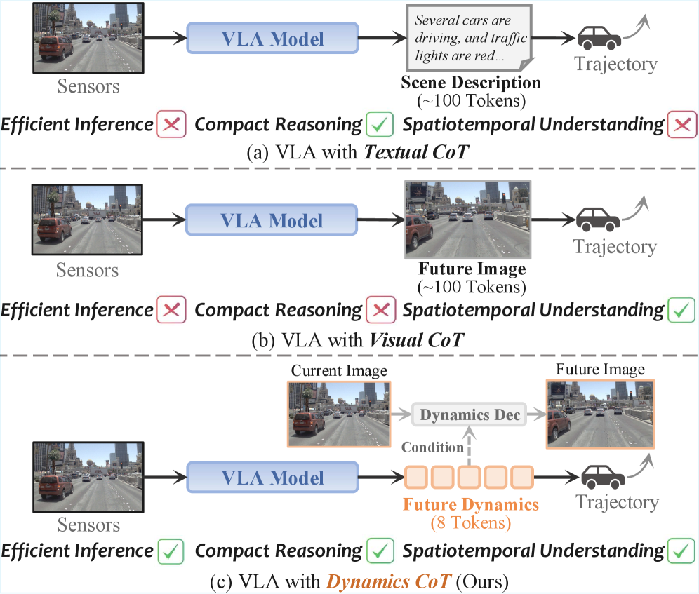 Figure 1: Traditional Textual CoT (a) is slow and lacks detail, while Visual CoT (b) is computationally heavy. Dynamics CoT (c) offers a compact, efficient, and accurate alternative by predicting future dynamics as discrete tokens.