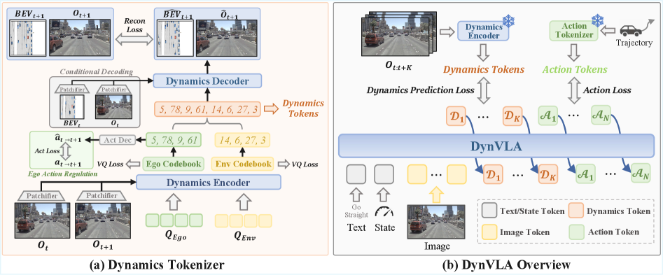 Figure 2: DynVLA extracts ego-centric and environment-centric dynamics from image observations, discretizes them into tokens, and uses these to predict future states before generating actions.