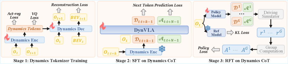 Figure 3: DynVLA's training pipeline involves learning a Dynamics Tokenizer, then SFT and RFT to generate dynamics tokens before action tokens.